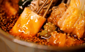 精心熬制四個小時的紅油,加了各種香料的冰鎮(zhèn)底湯,撒上用油炒的噴香的芝麻,合而為一才是冷鍋串的精髓,串串全部放入大缽缽中,再澆上香氣濃郁的料湯,食材吸收料湯后開始入味,浸泡的時間越久就越好吃,而最正宗的吃法還要加冰,想想這冰爽。