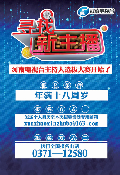 10月1日起,河南電視臺將啟動“尋找新主播”活動。這是由河南電視臺都市頻道承辦的一檔大型主持人選拔活動,選拔范圍輻射全國,無論你在哪里,無論你正在從事哪個行業(yè),只要您年滿18周歲,沒準兒下一個“新主播”就是你!