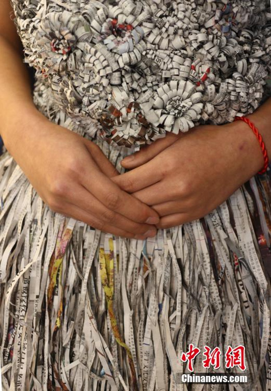 1月12日,成都職業(yè)技術(shù)學院數(shù)十名大學生將自己設(shè)計的期末作品——紙婚紗穿上展示,這些作品都是經(jīng)過數(shù)天時間手工制作而成,以報紙、衛(wèi)生紙、成績單等作為原材料,大學生在完成個性化的婚紗定制的同時還倡行了廢物利用的環(huán)保理念。圖為大學生穿上自己的紙婚紗作品。 張浪 攝