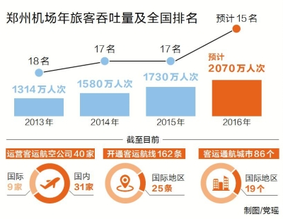 據(jù)鄭州機(jī)場(chǎng)相關(guān)負(fù)責(zé)人介紹,2014年鄭州機(jī)場(chǎng)旅客吞吐量突破1580萬人次,同比增長20%,增速位居全國20個(gè)大型機(jī)場(chǎng)首位。